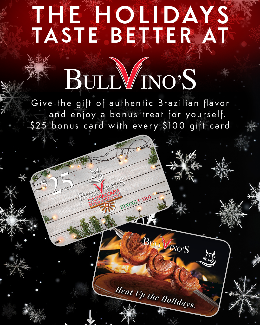 For a limited time only, when you buy $100 in Bullvino’s gift cards, you’ll receive a $25 bonus card to use on a future visit.